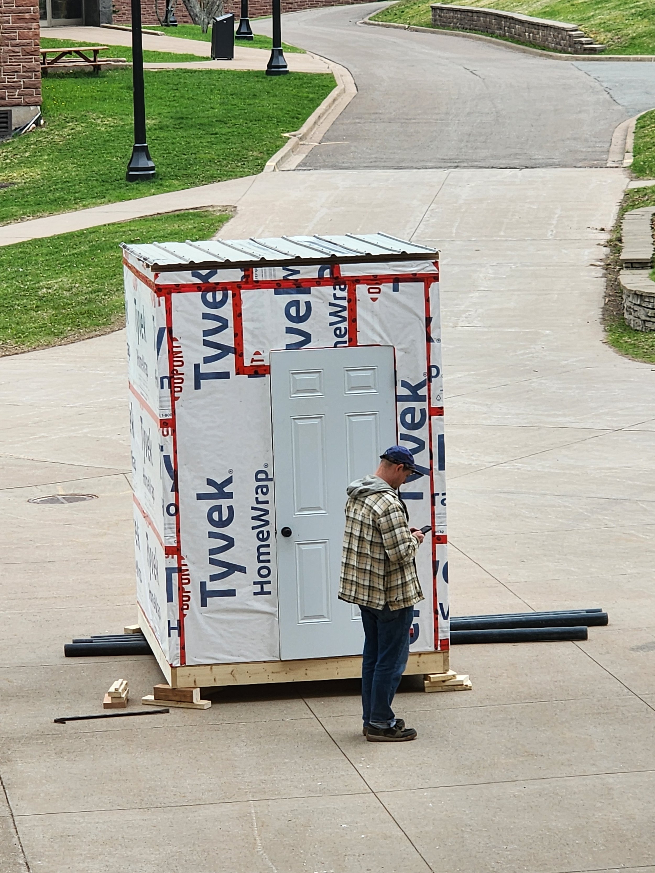 The exhibition includes a series of screen prints, videos, installations and sculptures that explore the dysfunctions of a housing system that conflates Housing as a human right with Housing as financial asset. The works consider the material language of the residential building industry and the agency of skilled trades workers in the crisis. A major component of the exhibition is the introduction of the term "the Speculator's Gaze" which describes a way of seeing that divorces a Home(land) from all the things that make it a Home(land) and presents only a commodity for possession, extraction and speculation. Among other things, the exhibition includes a 15ft tall sculpture of one square foot of the corner of a house, built to a 1:1 scale, and according to Section 9 of the Canadian National Building Code. The exhibition also includes a video showing documentation of a participatory workshop that I facilitated for students in which we built an emergency housing shelter following the design by Halifax Mutual Aid.